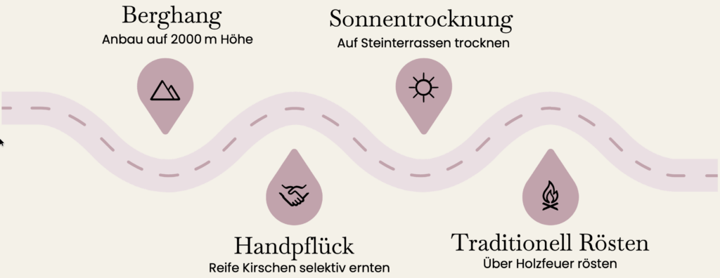 Sonnentrocknung auf jahrhundertealten Terrassen bewahrt den natürlichen Fruchtgeschmack und verleiht dem Kaffee seine charakteristische Süße.